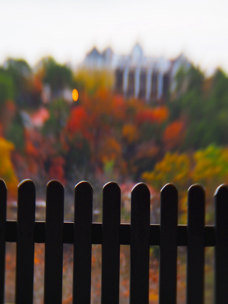 The Picket Fence Published November 11, 2013 at 768 × 1024 in The Picket Fence Focusing on the picket fence from the overlook lets everything beyond melt together in a blur of colors. The Crescent sits there atop the trees.