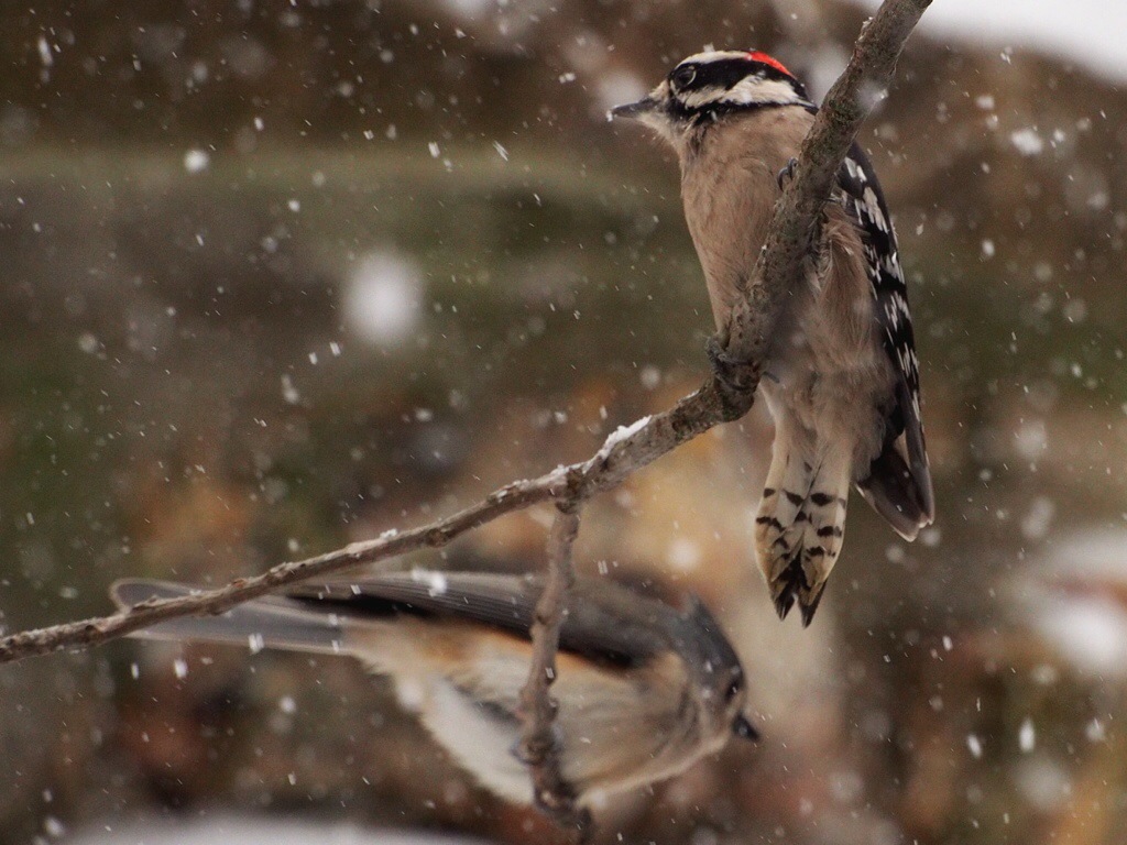 Downy Woodpecker & Titmouse Published December 10, 2013 at 1024 × 768 in Downy Woodpecker & Titmouse I was here first – get off my limb