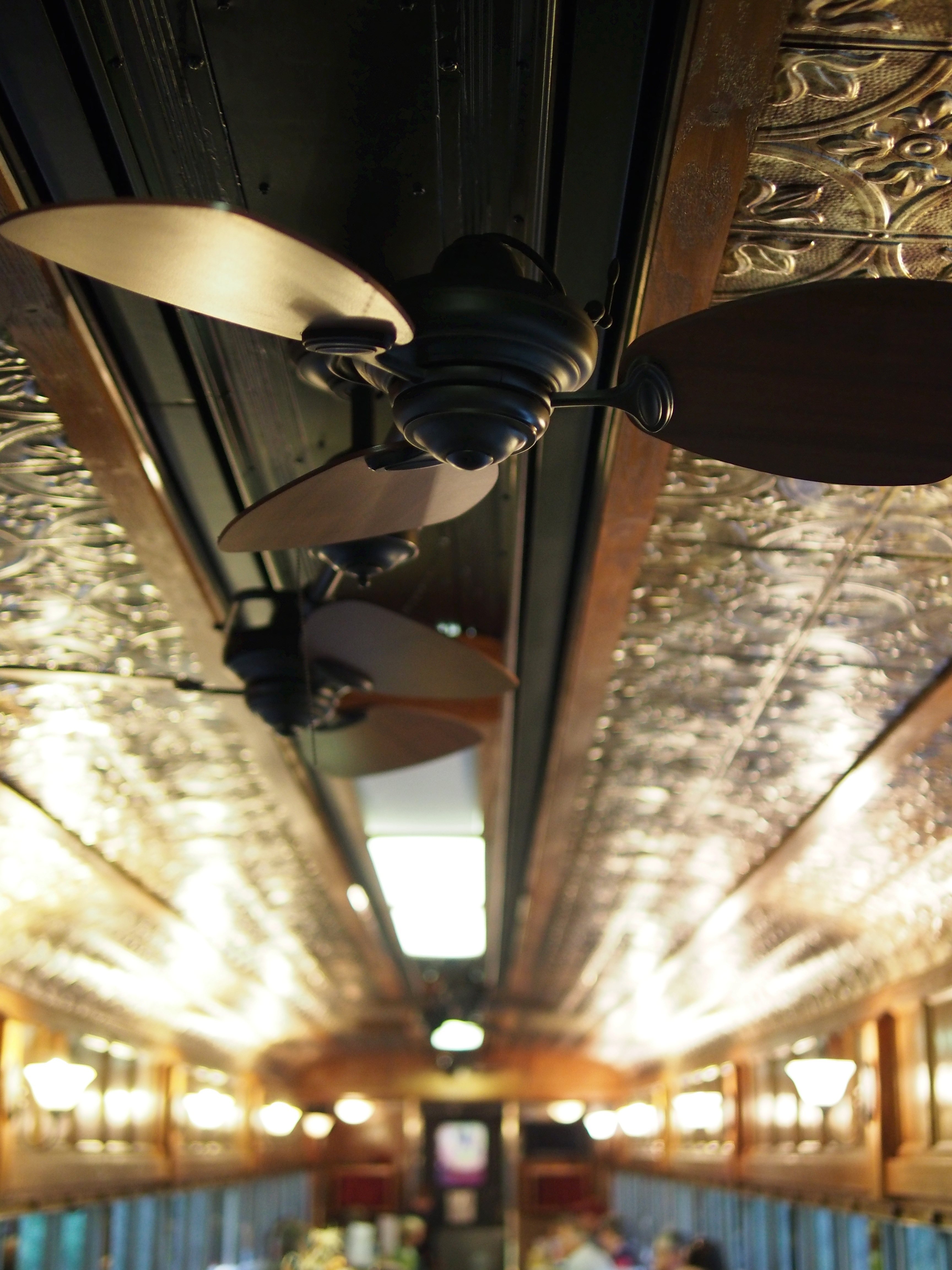 Here’s a view of the dining car ceiling fans in the afternoon light.