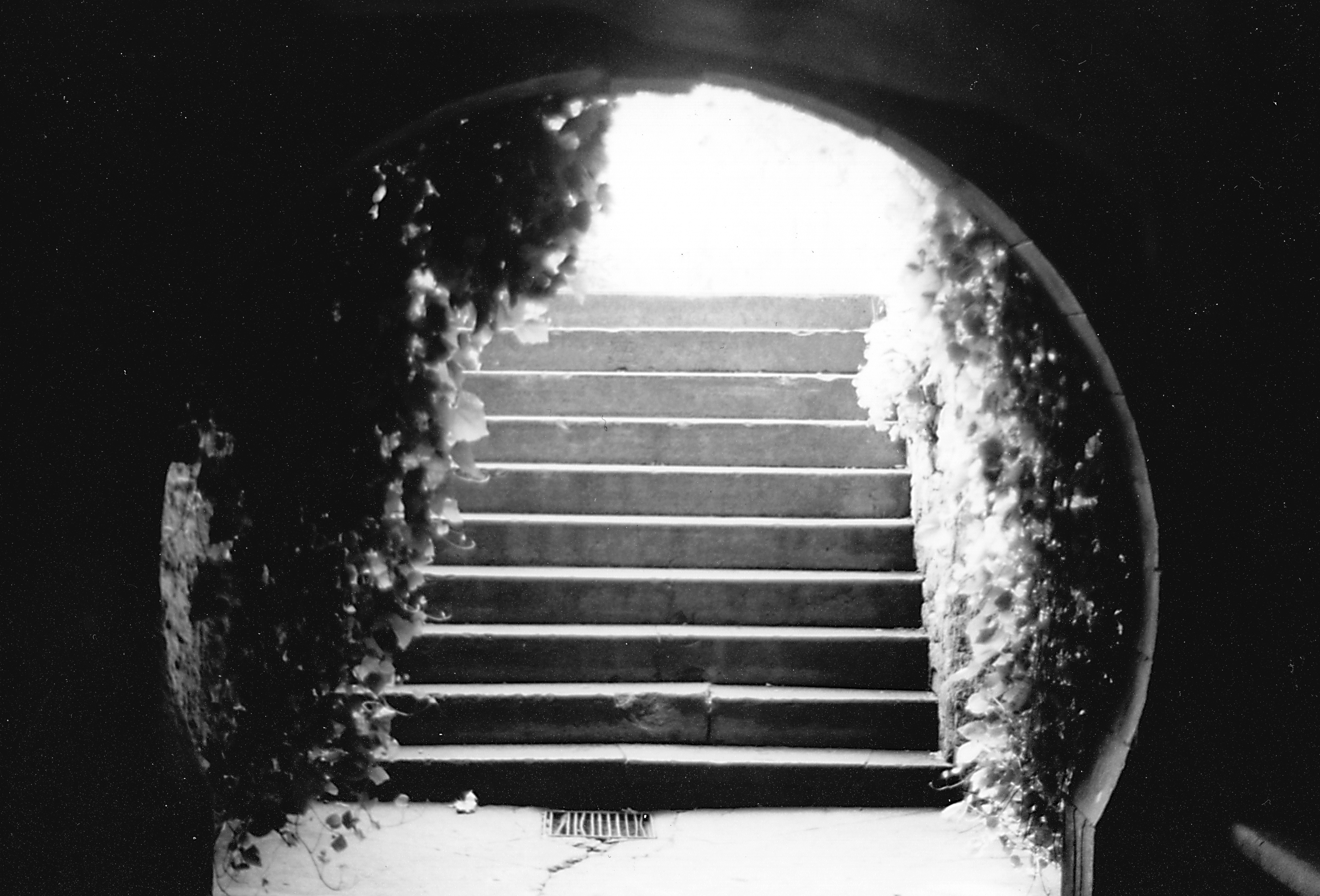 Next I tried an angle – it lets the texture of the limestone stairwell come alive, this one feels more like the experience of being underground and looking up into the light.