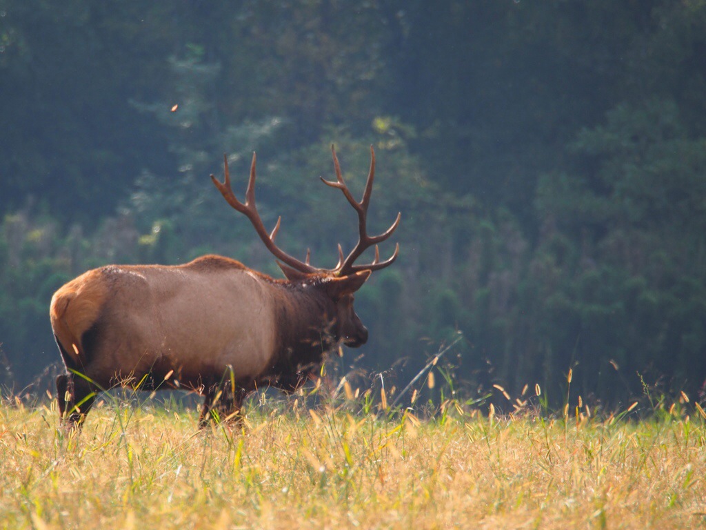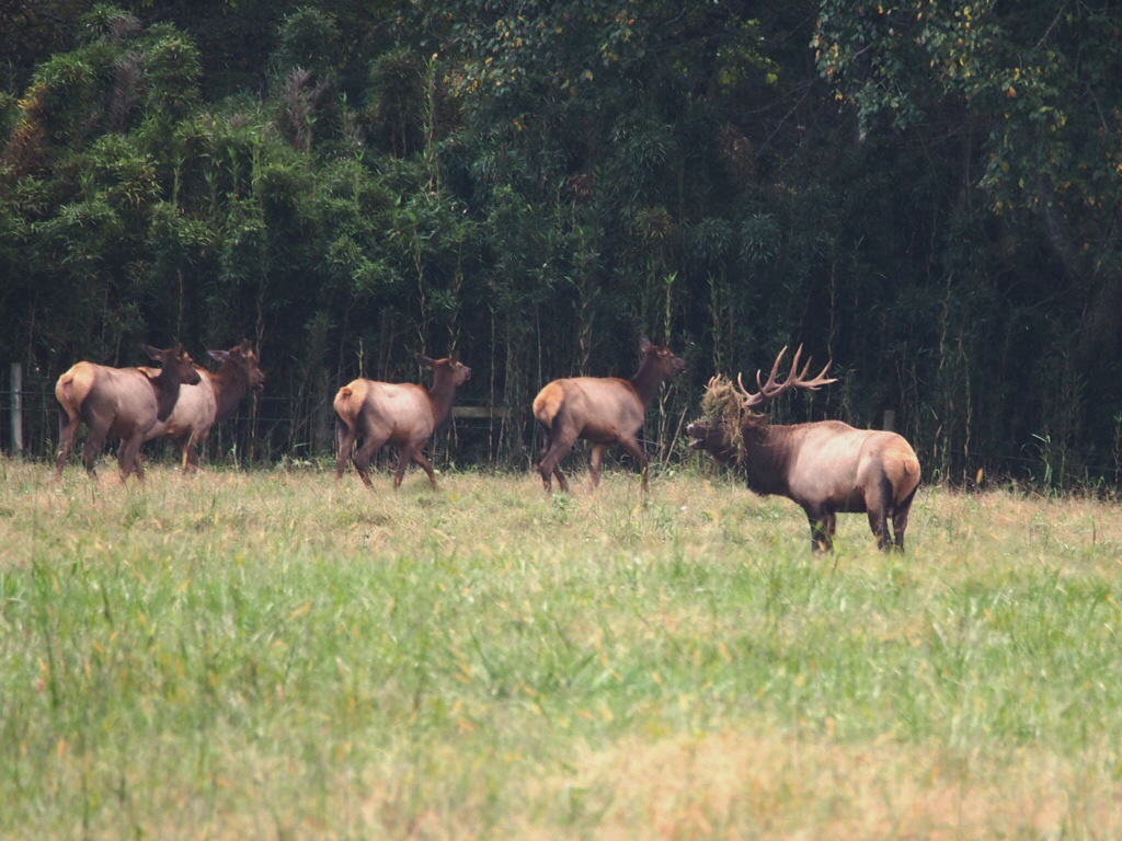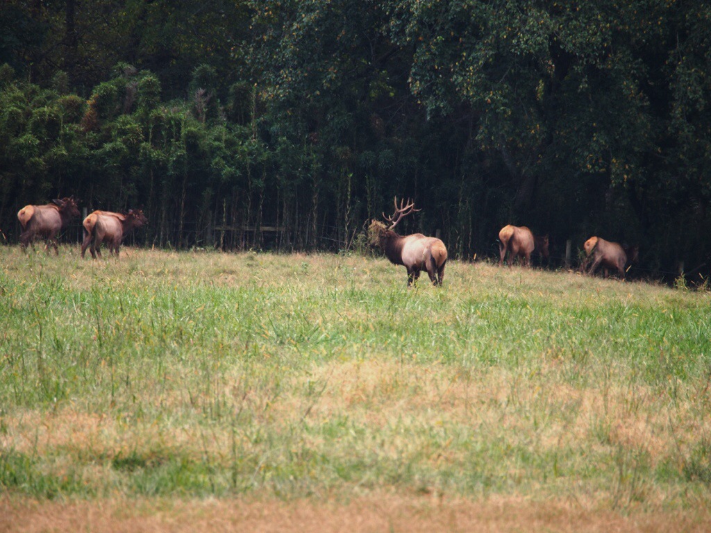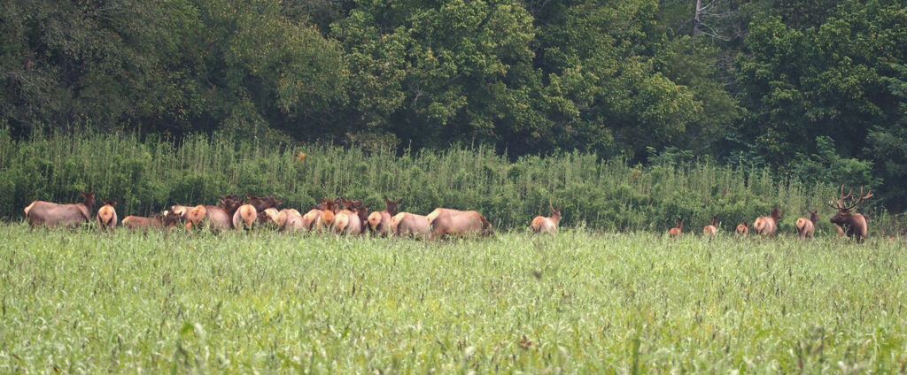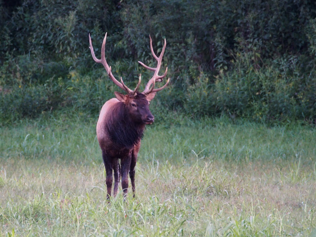 I returned to the valley on Saturday at dawn with some friends. We saw a few adolescents as we checked out both ends of the valley. As we headed north we saw a lot of parked cars alongside the highway – always a good sign. We parked just in time to see Pretty Boy moving his harem into the river cane. The size of his group was markedly smaller – maybe 20 cows. We saw him at the corner of the meadow, he bugled and all those cows bolted and followed him behind the curtain.