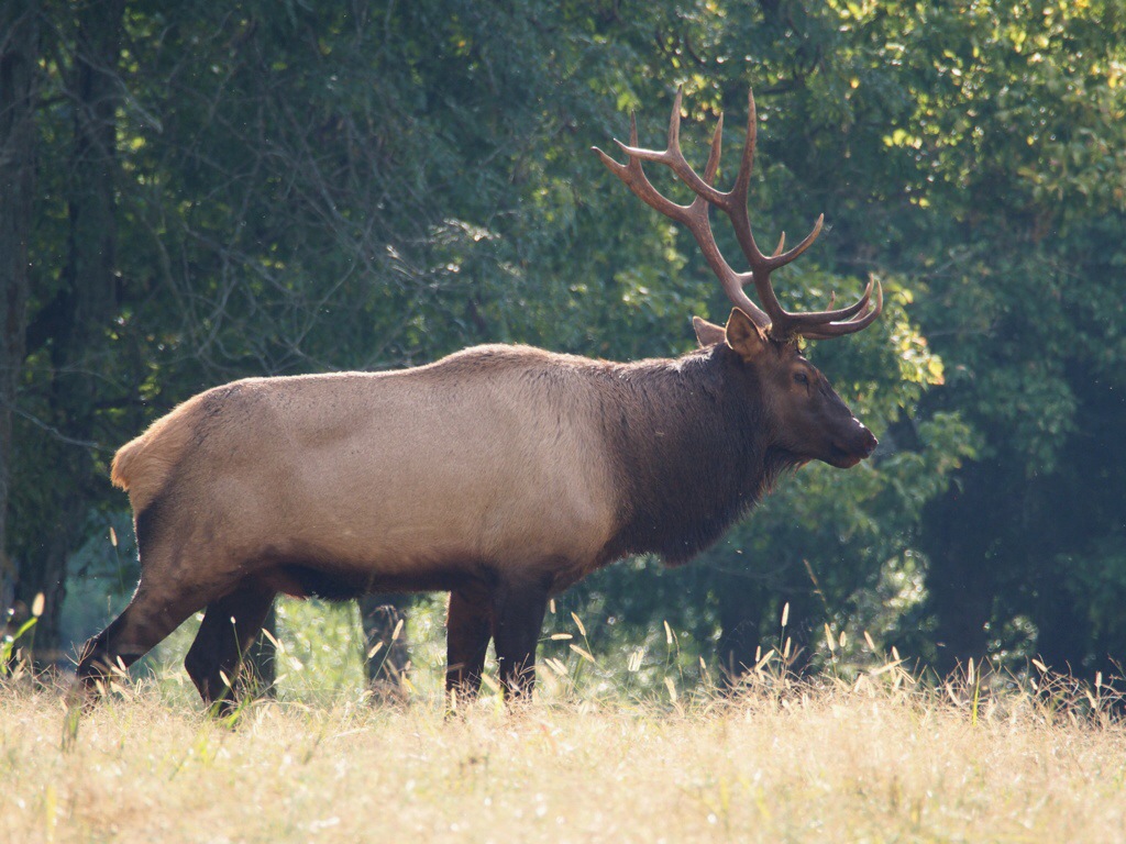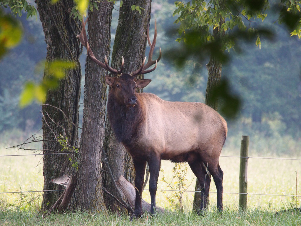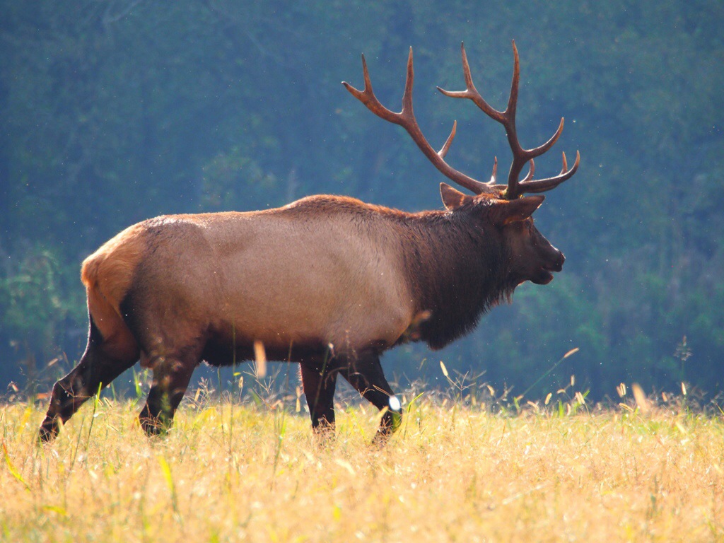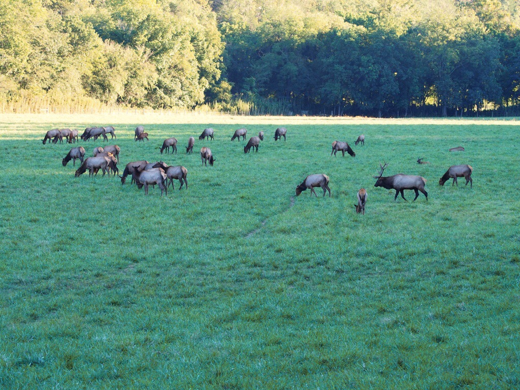 I returned to the valley on Saturday at dawn with some friends. We saw a few adolescents as we checked out both ends of the valley. As we headed north we saw a lot of parked cars alongside the highway – always a good sign. We parked just in time to see Pretty Boy moving his harem into the river cane. The size of his group was markedly smaller – maybe 20 cows. We saw him at the corner of the meadow, he bugled and all those cows bolted and followed him behind the curtain.