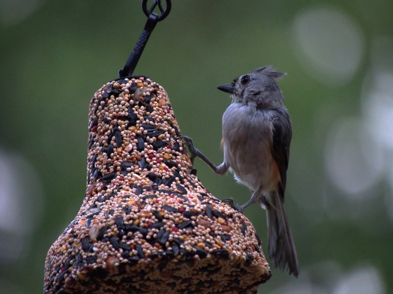 I know I have blue jays, but they seem to stay just out of reach. The clerk tells me the key to attracting them is to get a peanut feeder. So I oblige. I also love peanuts and these are pretty tasty – the jays are in for a treat. Unfortunately they are not at all interested in hanging out on the porch with me at the buffet. Honestly, I think I’m the only one eating peanuts. This titmouse tried for about 15 minutes to get one out of the feeder and gave up.