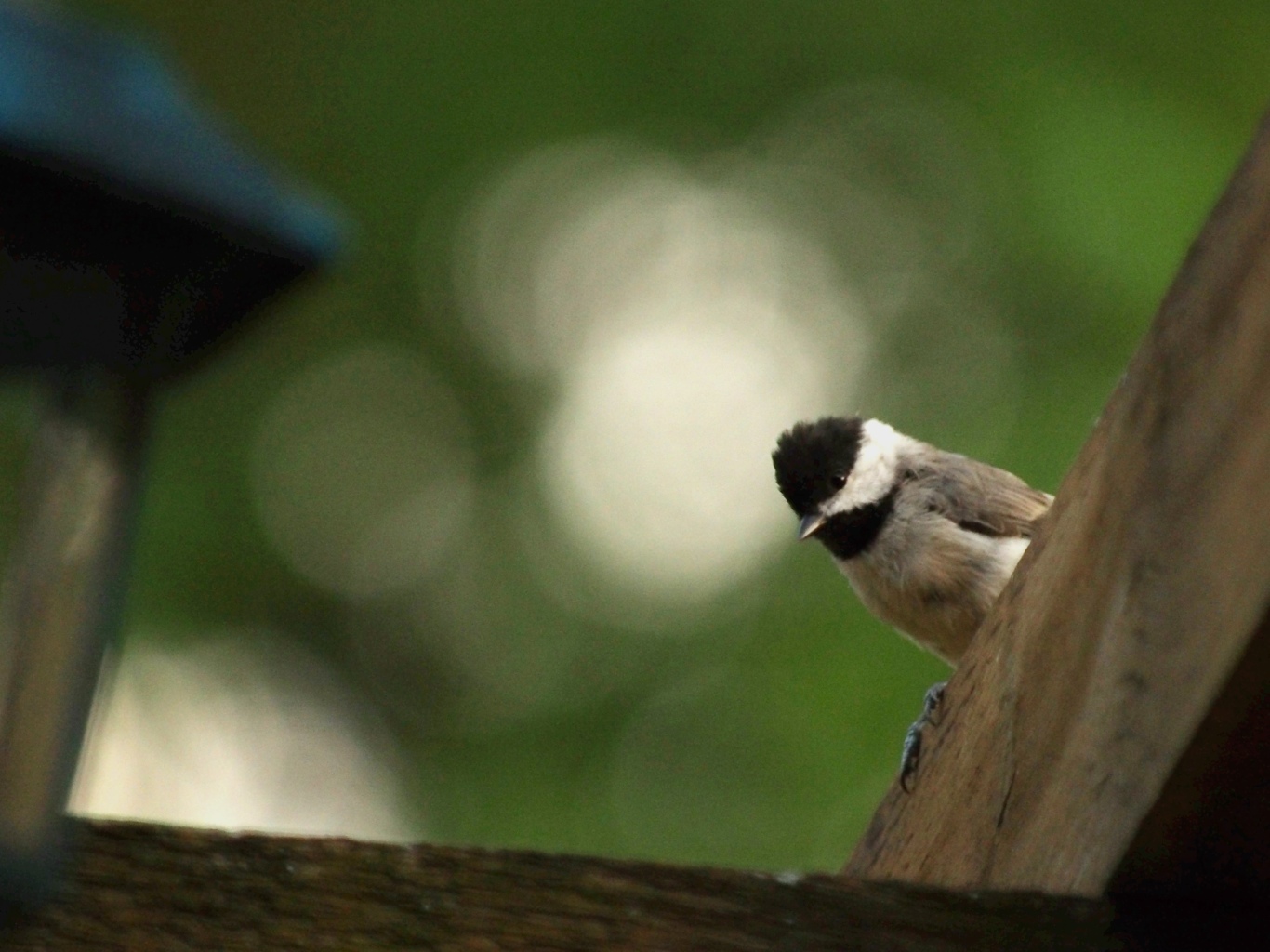 I hung the feeder. A day passed – no birds. A week passed, nothing. Two weeks, not a seed on the patio. Finally, just short of three weeks there was a flurry of activity – dozens of birds vying for one of the perches. This bossy chickadee usually wins the battle for the perch at the bottom.