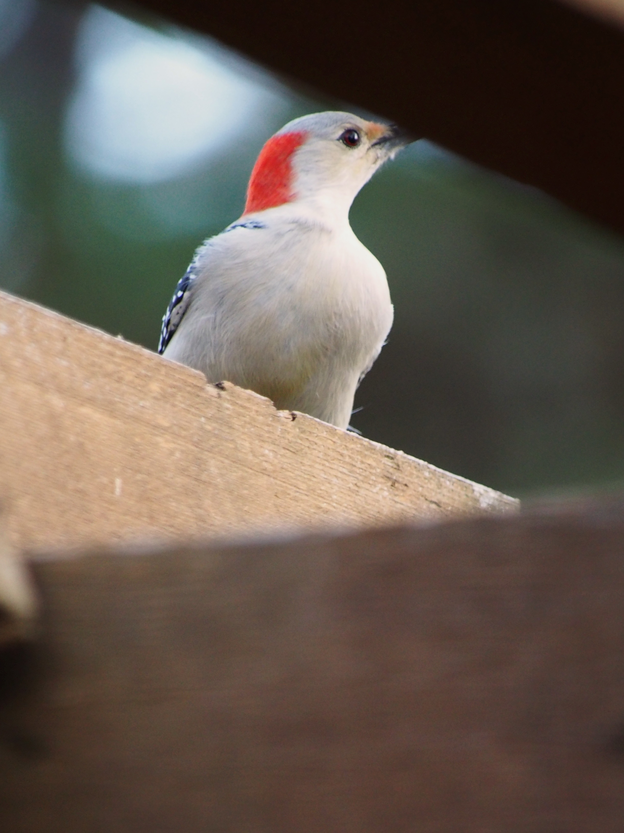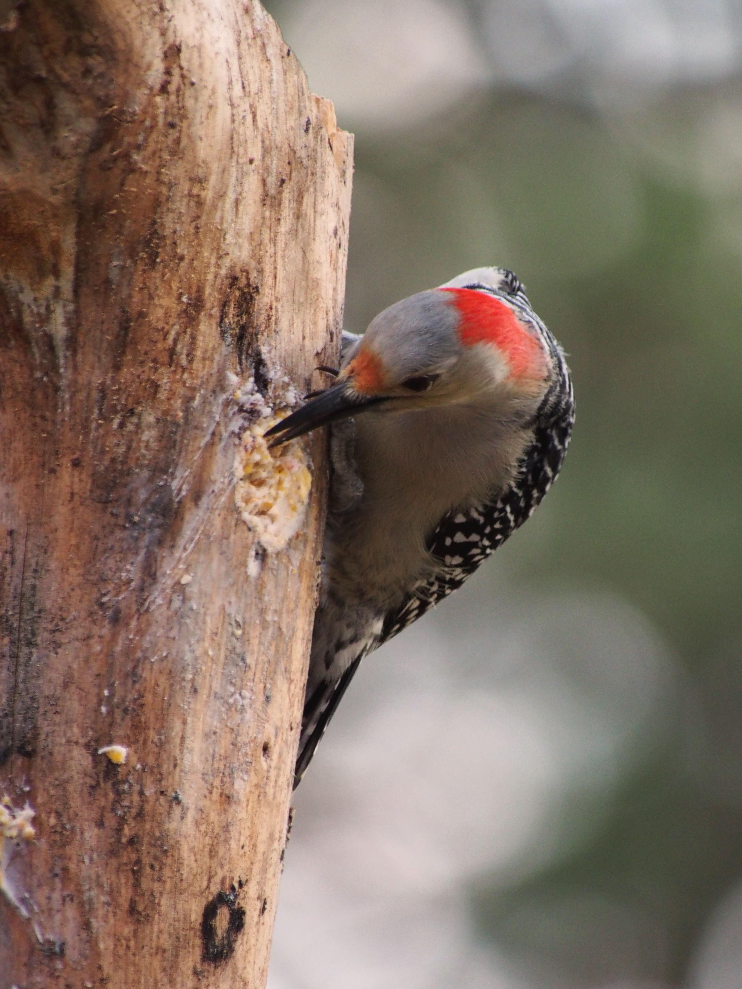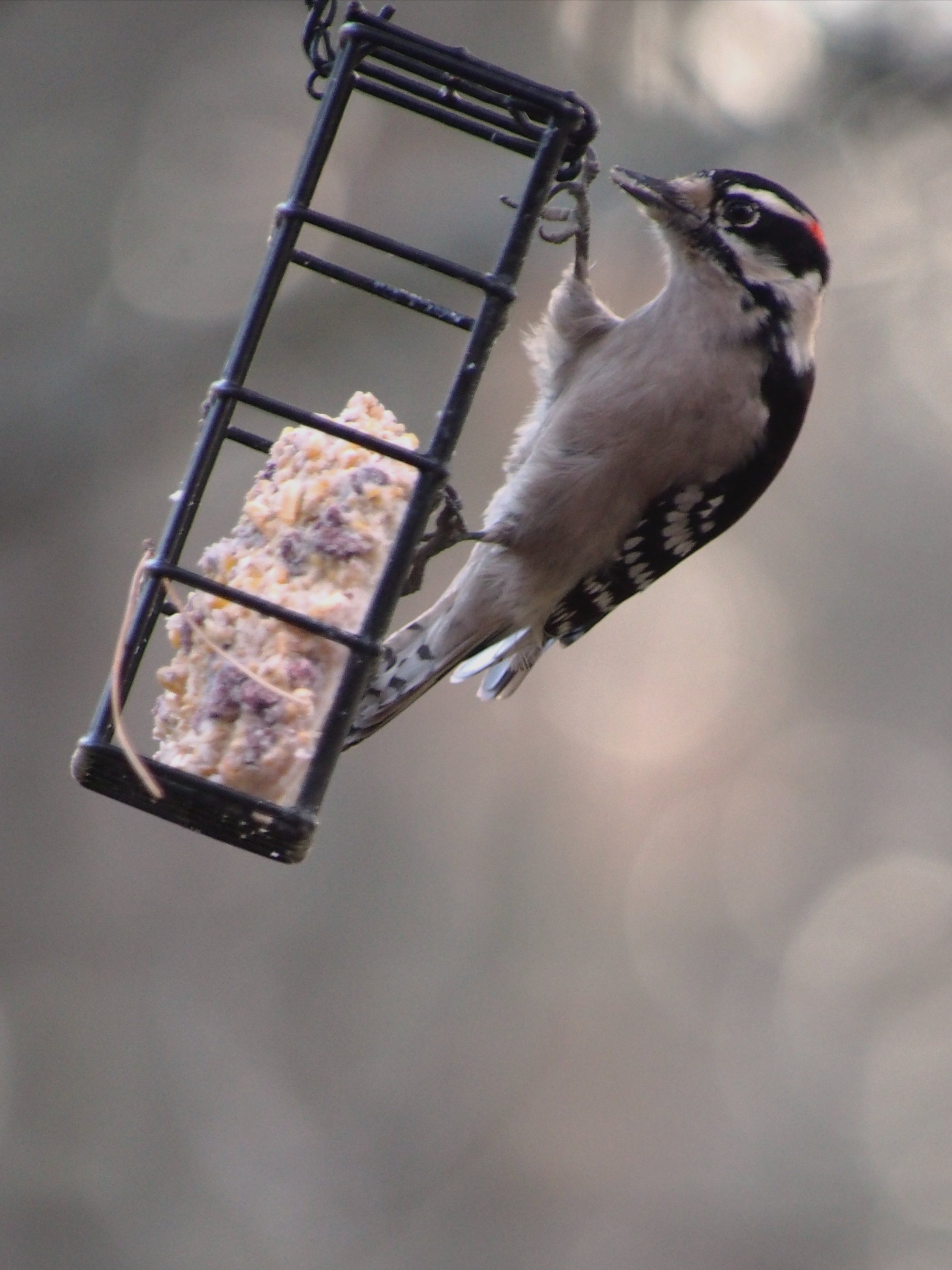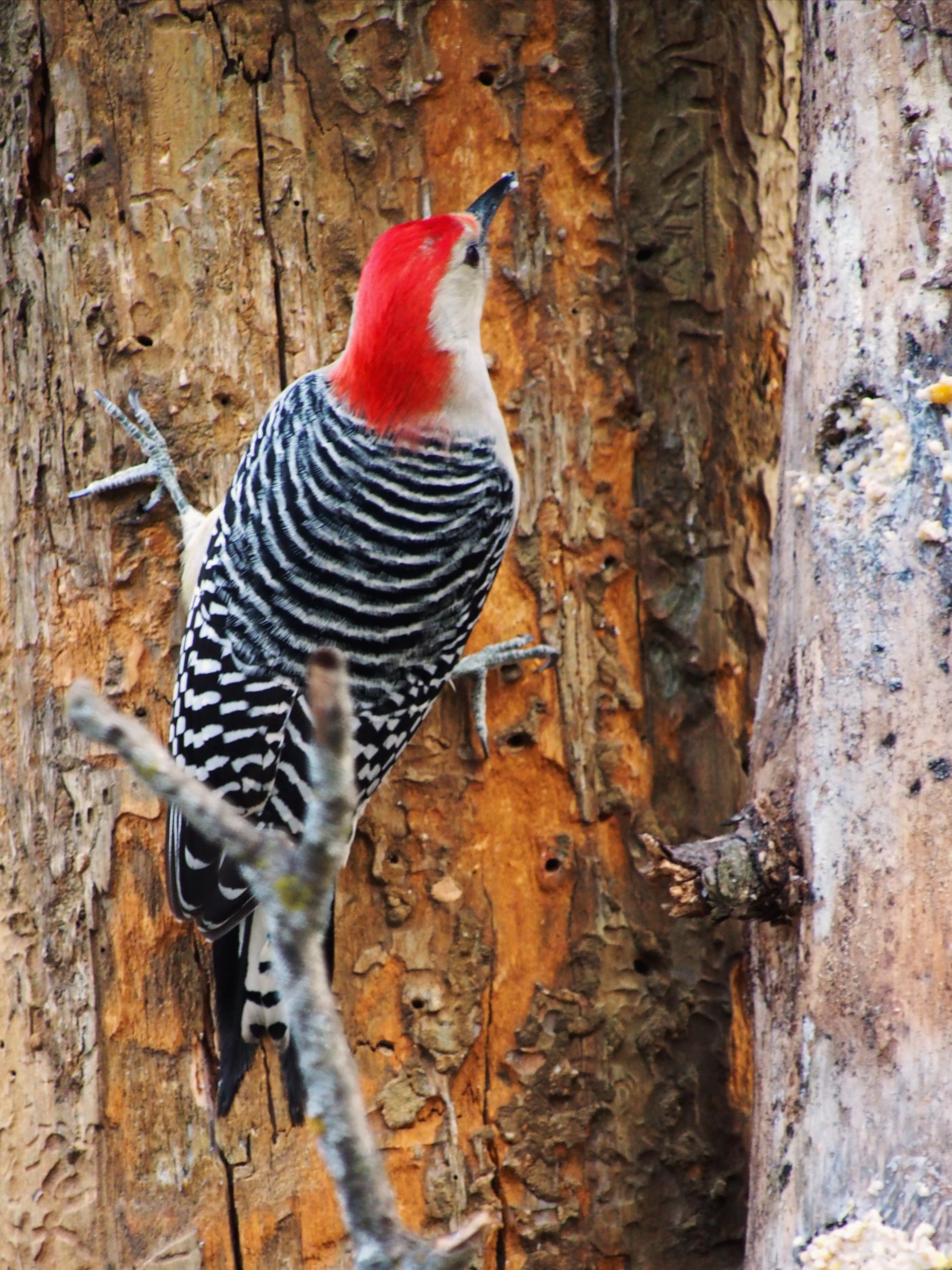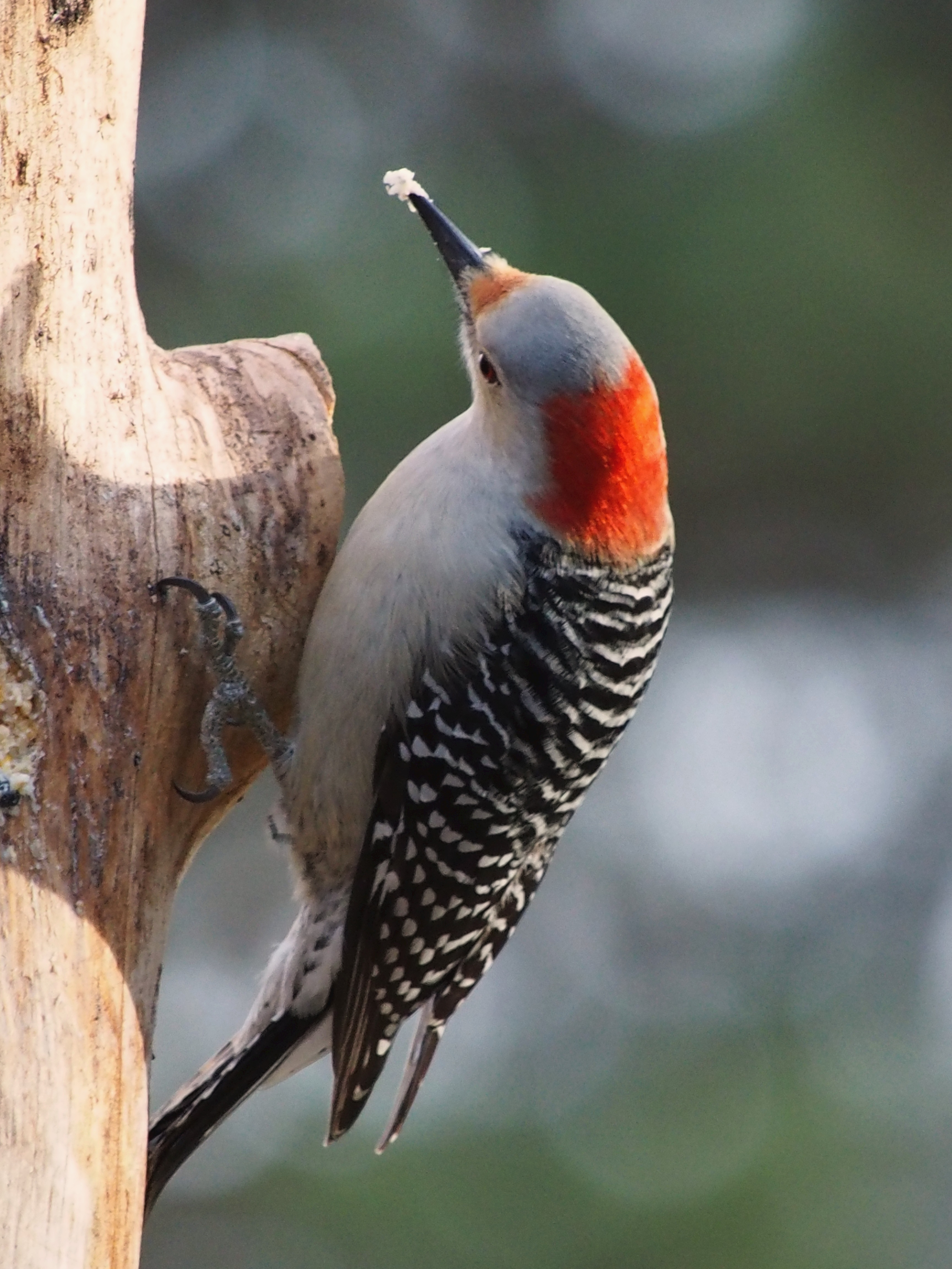 I put on my Carharts and tucked my weatherproof camera and lens inside my jacket. The activity around the house was extraordinary. Cardinals were hanging onto the branches of the crepe myrtle for dear life. A fallen tree limb over the pergola was a lifeline to a small woodpecker as winds blew snow almost sideways. Birds that typically dart away held fast in hopes of spotting fallen seed below on the patio.