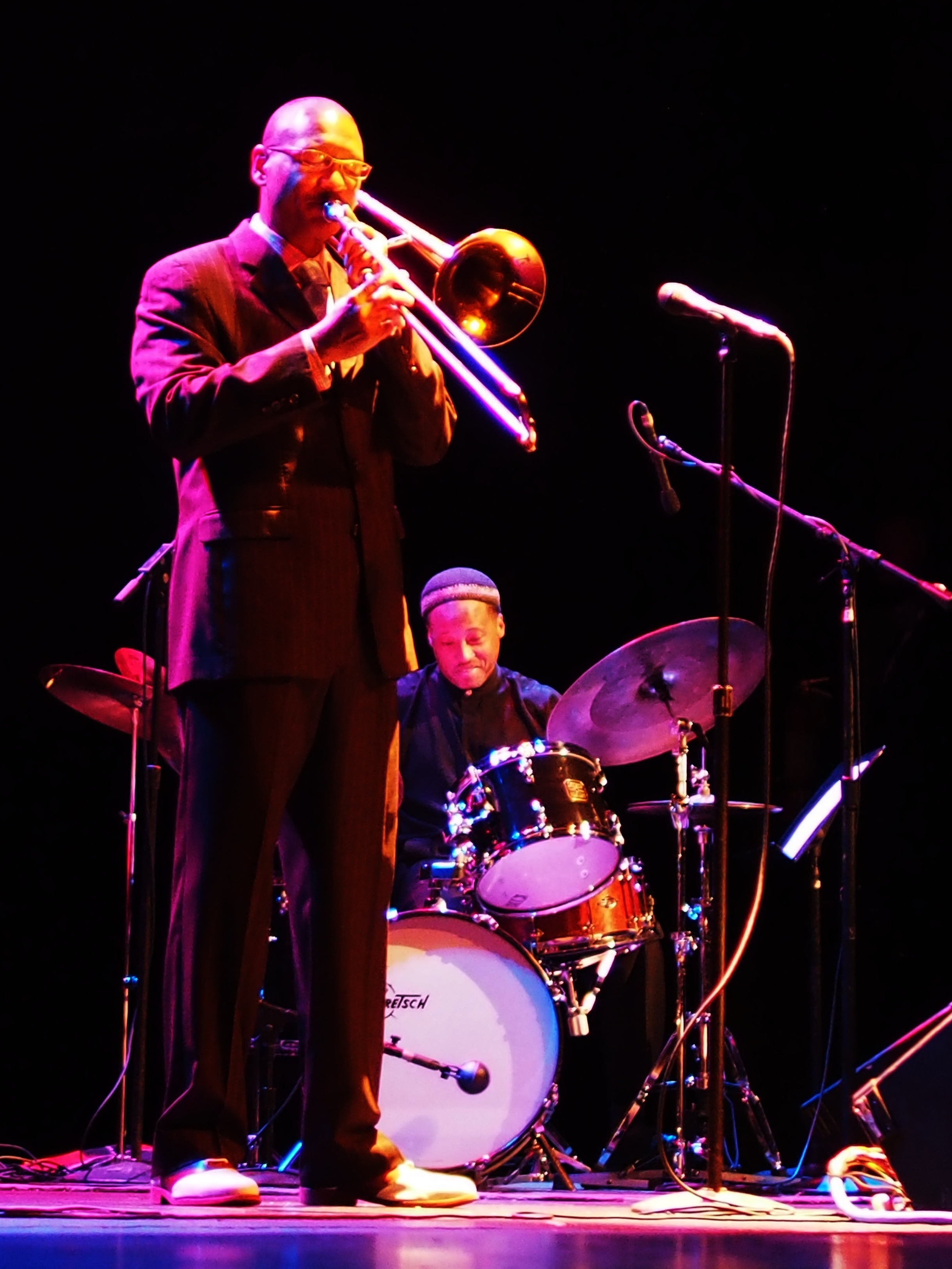 I took a few shots and was intrigued by the color – the lights were casting purple and yellow hues on the musicians and their instruments. I loved the colors and how they seemed to express the coolness and crispness of the sounds of the trombone.
