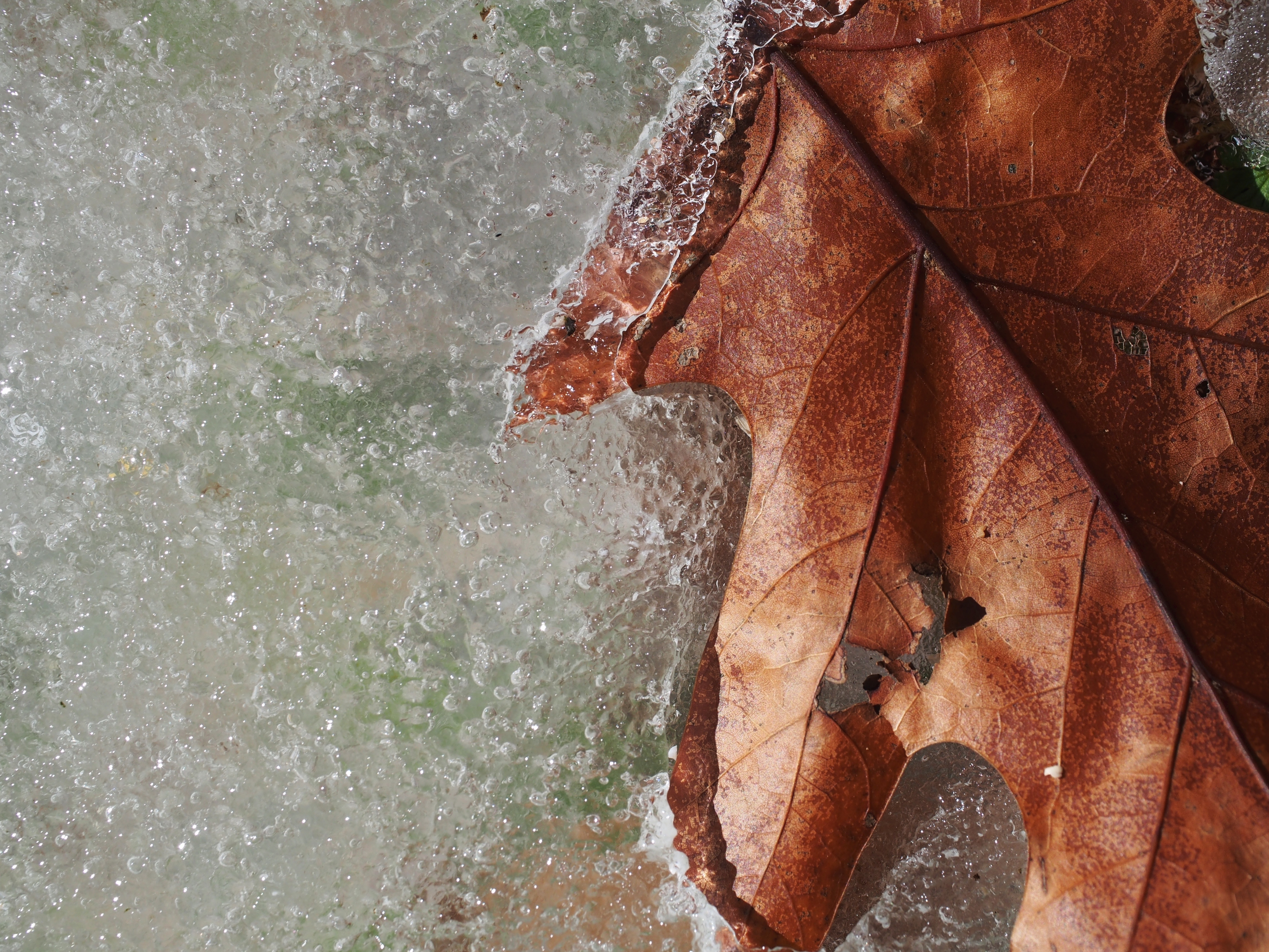 I don’t get my gear ready and think, “Wow, I hope I can find some leaves in the ice today!” I tend to come upon things that capture my interest. I have always been drawn to transparency and light. Anything with complimentary colors makes me take a second look. Texture intrigues me.