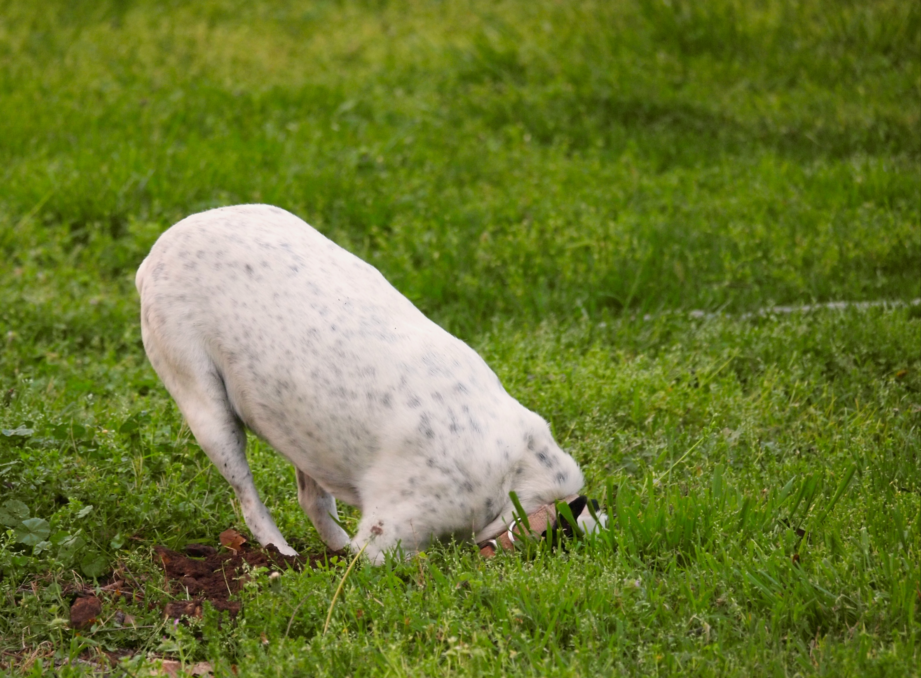 She almost flattens her thick body into the turf – when I mow she stays ahead of me, enjoying the deep grass as long as possible. She does not care for new-mown grass.