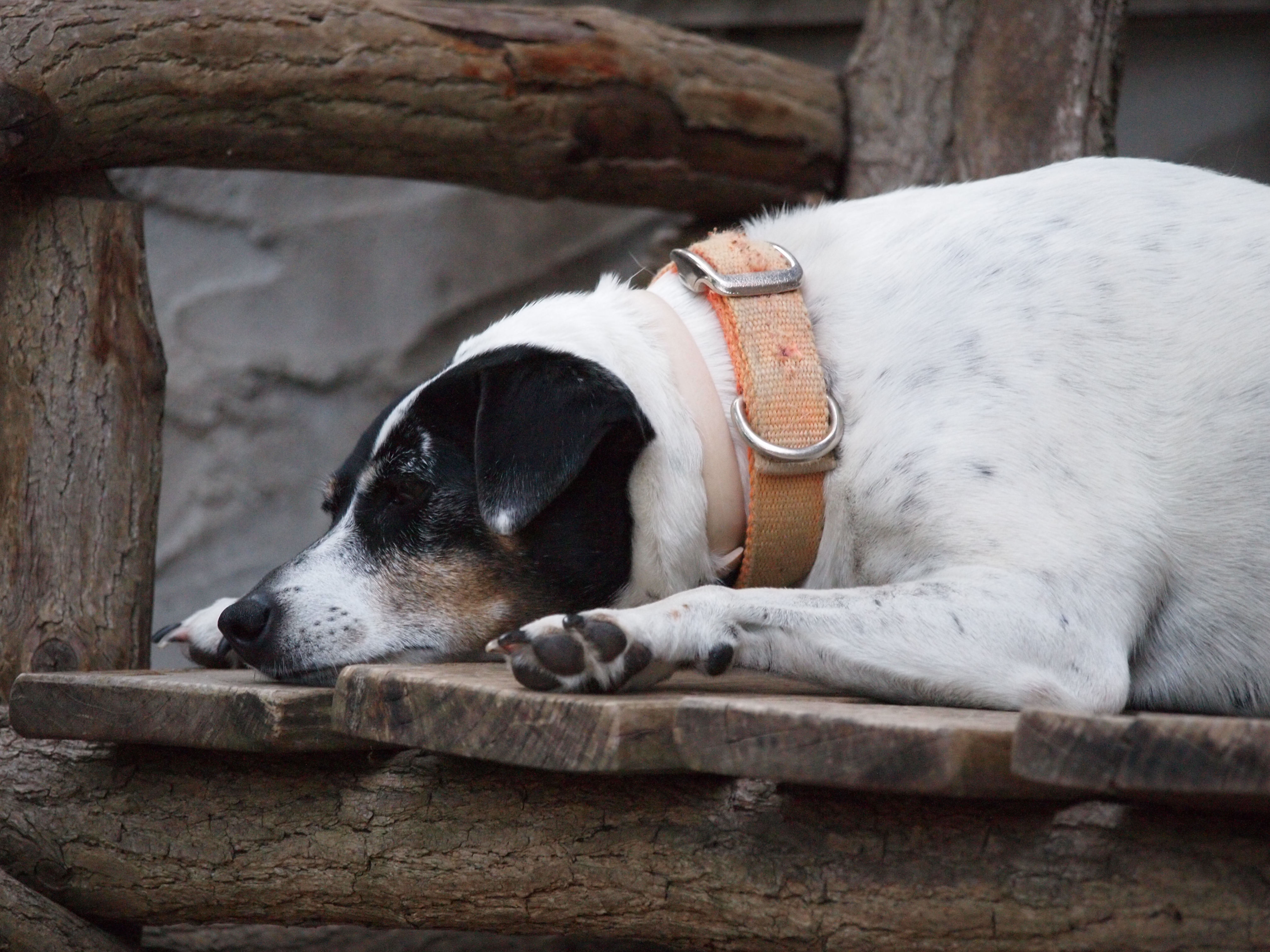 About 8 years ago I was shopping in Fayetteville, Arkansas at Petco. A friend and I had made a “dog food run” from Eureka Springs about 40 miles away. On this particular Saturday there was a Dog Adoption Fair in the parking lot out front by a group called Save Our Strays. I own a couple of Jack Russell Terriers so my eye stopped on an odd-shaped terrier in a kennel cage. She had a smaller head than my Jacks, but a much larger body. She was shaking like a leaf – this is not typical terrier behavior – they are more likely to pace or verbalize nervousness. I also noticed that she was no puppy. Most of the dogs there that day seemed to be cute little puppies. I stopped to ask some details and learned that this group visited the local shelter every Saturday and picked up all the dogs they could haul that were scheduled to be put down on the following Tuesday. My heart sank! I told her I would think about it while I shopped – I stepped inside the store and mentally went back and forth – I already had 2 terriers – plenty of dogs for me. Did I want the extra responsibility? Would it detract from my other pups? By the time I checked out I had picked out a collar – she was coming home with me. After all I had terrier experience and she was an older dog. I could give her a good life.